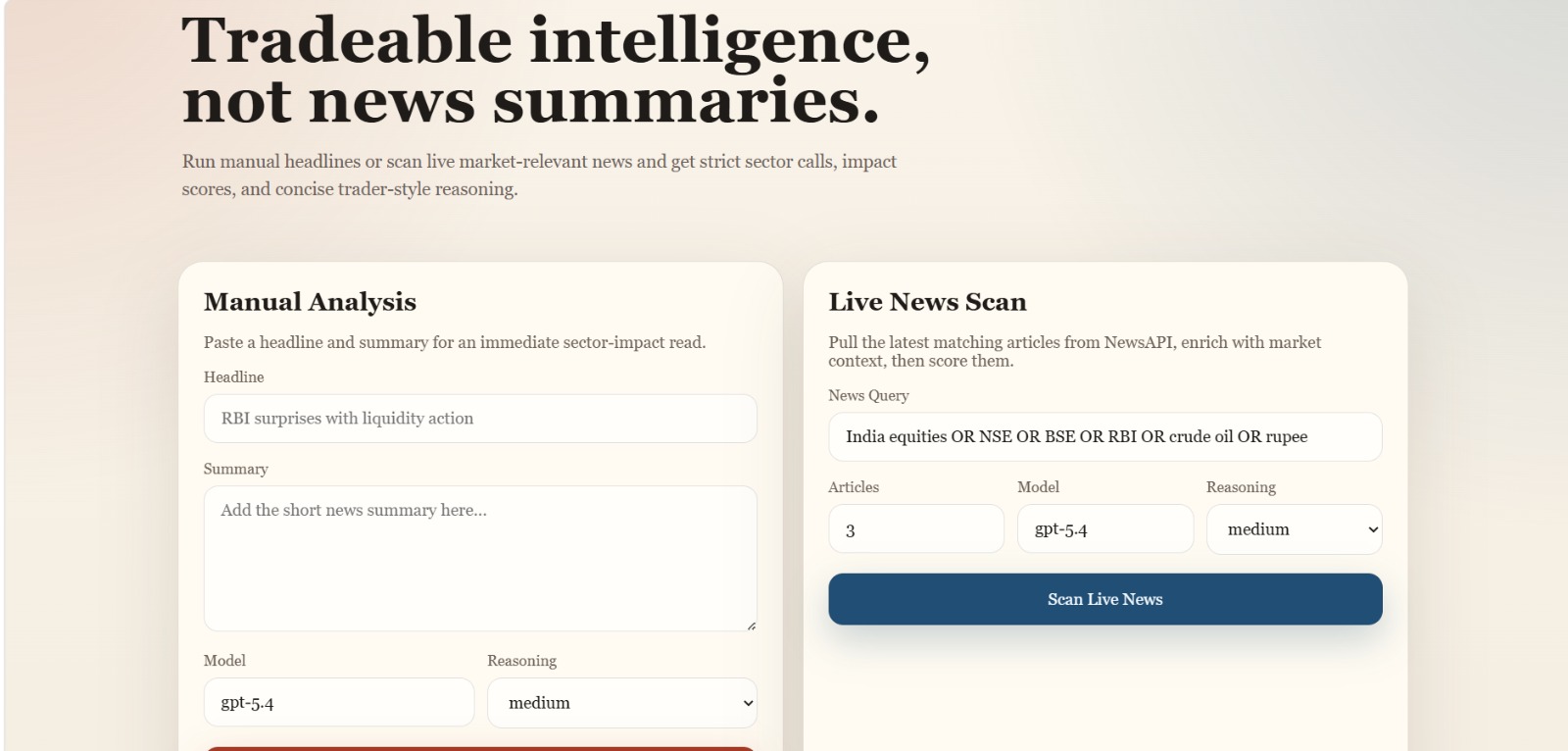 A market analysis engine that reads current news flow or manually entered developments to evaluate sentiment conditions and identify the sectors most affected by emerging market narratives.